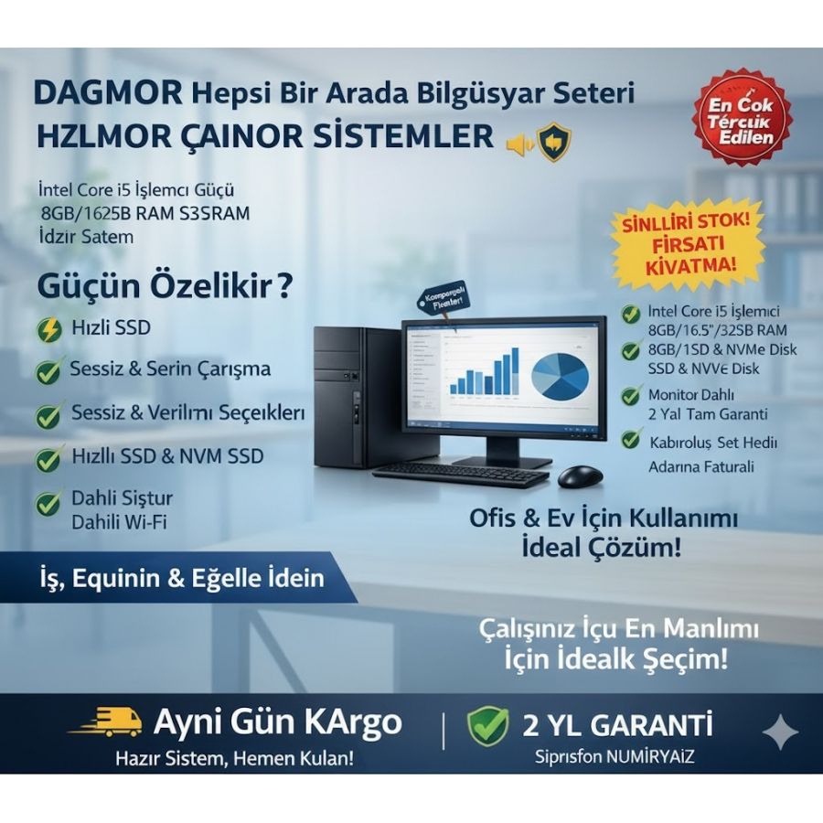 Ofis ve ev kullanıcıları düşünülerek hazırlanmış bu masaüstü bilgisayar; stabil performansı, hızlı açılışı ve uzun ömürlü donanımı ile günlük tüm ihtiyaçlarınızı rahatlıkla karşılar.